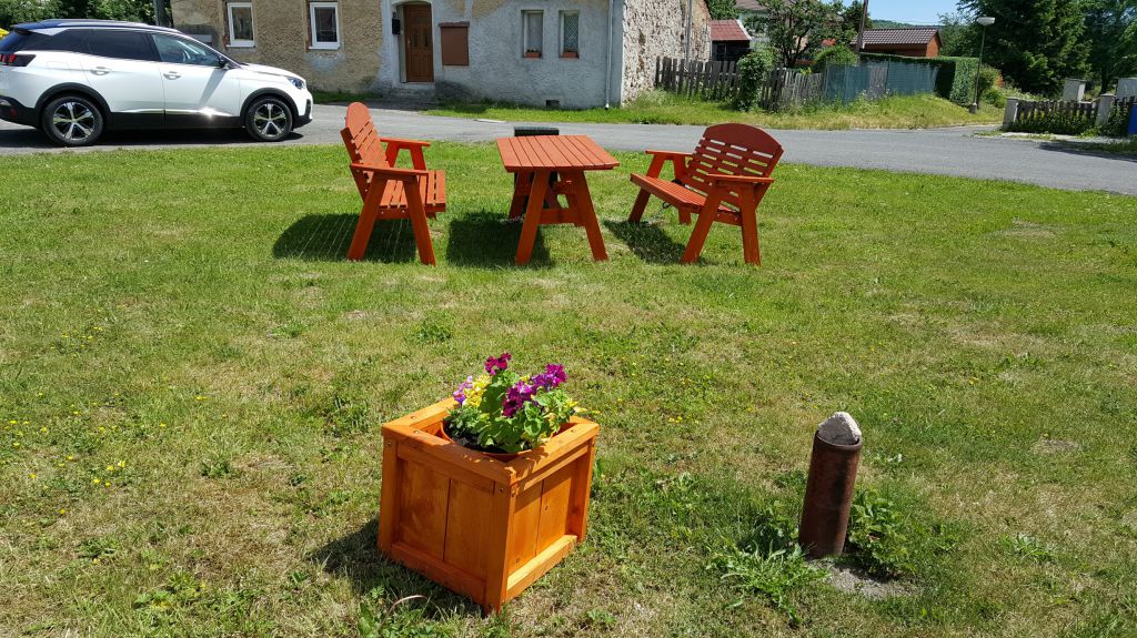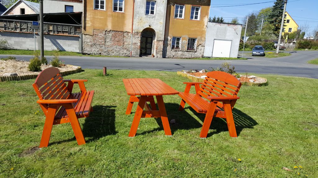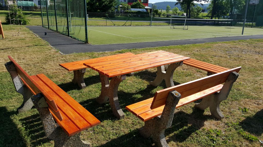 Lavičky od kostela byly přeneseny na hřiště.Prkna vyměněna a nalakována.