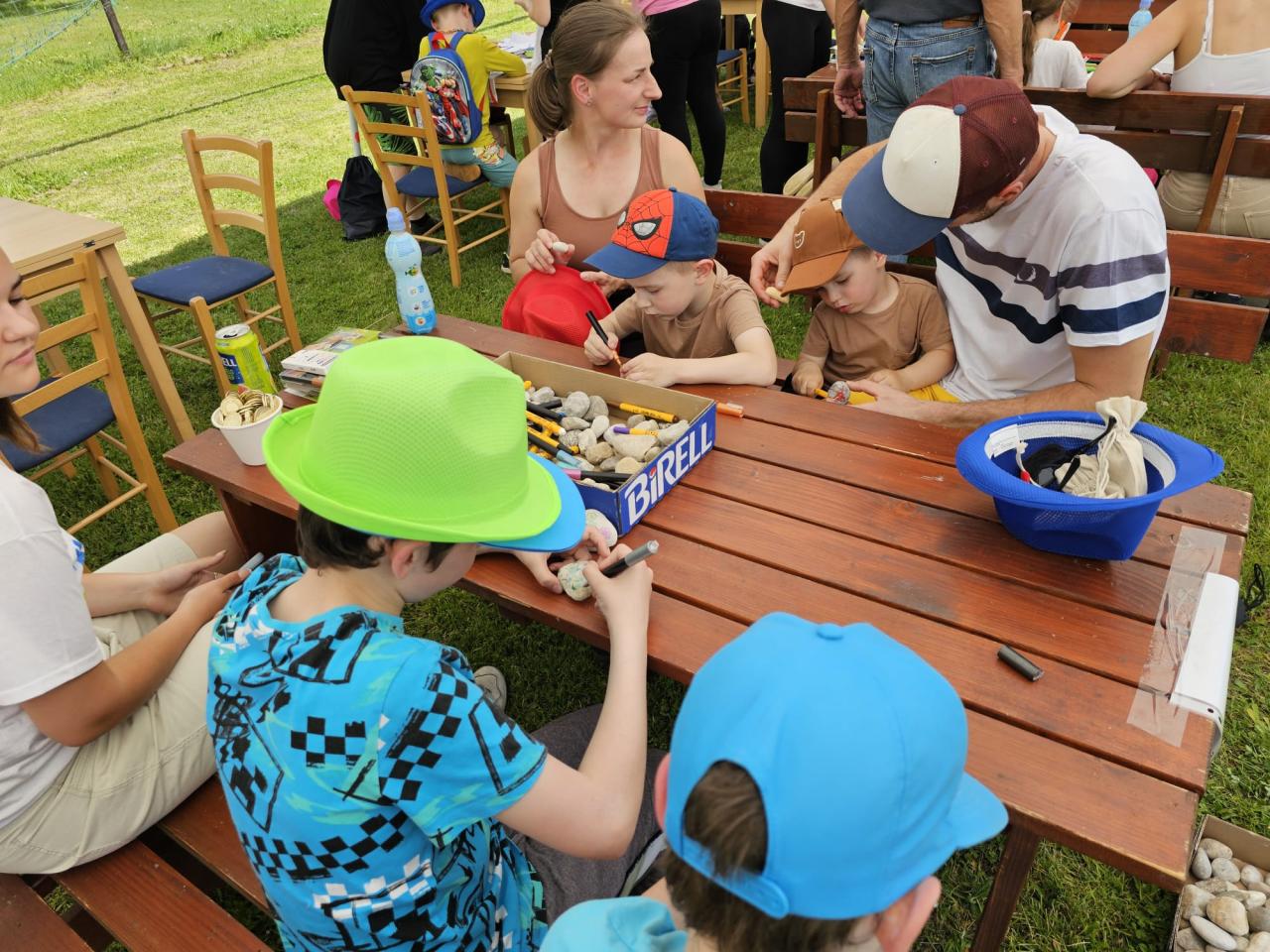 Dvojčata Hronových pokreslují pod dozorem maminky oblázky.