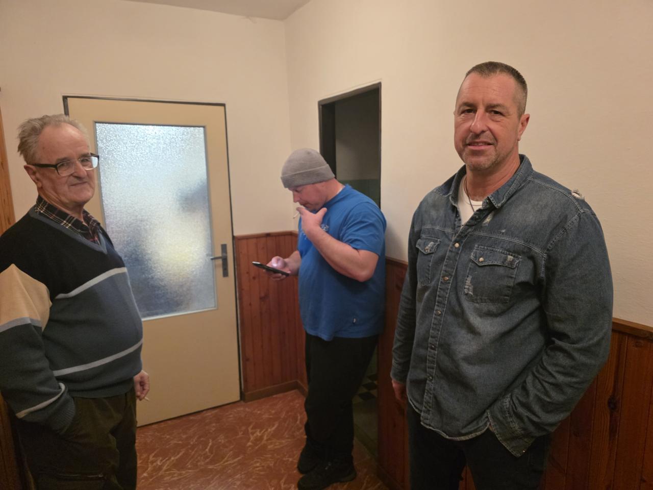 Na kuřácké pauze : p.Macák st. se synem Martinem do mobilu zírá Pepa Železný